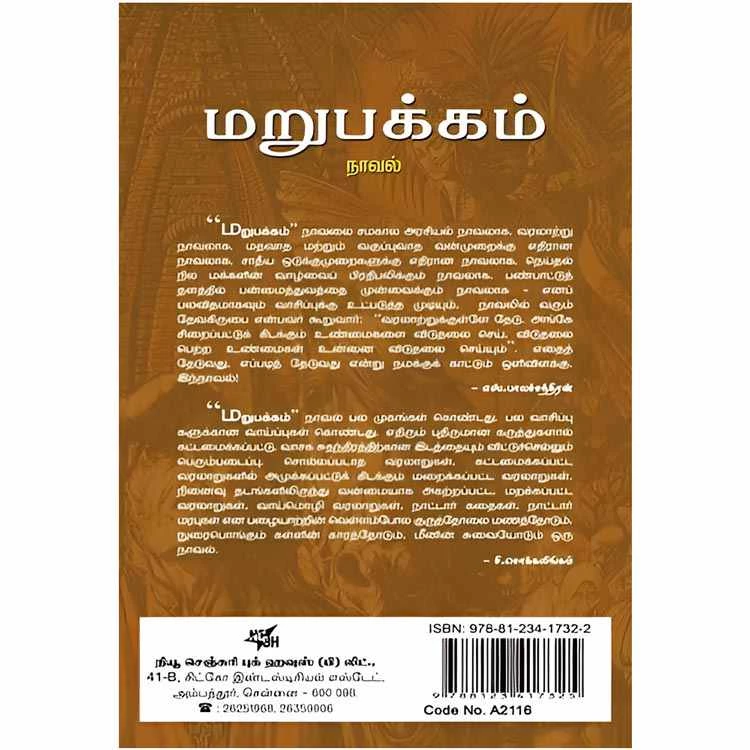 Details : ISBN : 9788123417325 Author : Ponneelan Weight : 100.00 gm Binding : Paper Back Language : Tamil Publishing Year : 2010 Code no :A2116 மறுபக்கம் : “மறுபக்கம்” நாவலை சமகால அரசியல் நாவலாக, வரலாற்று நாவலாக மதவாத மற்றும் வகுப்புவாத வன்முறைக்கு எதிரான நாவலாக சாதிய ஒடுக்குமுறைகளுக்கு எதிரான நாவலாக நெய்தல் நில மக்களின் வாழ்வைப் பிரதிபலிக்கும் நாவலாக, பண்பாட்டுத் தளத்தில் பன்மைத்துவத்தை முன்வைக்கும் நாவலாக எனப் பயவிதமாகவும் வாசிப்புக்கு உட்படுத்த முடியும், நாவலில் வரும் தேவகிருபை என்பவர் கூறுவார்: “வரலாற்றுக்குள்ளே தேடு. அங்கே சிறைப்பட்டுக் கிடக்கும் உண்மைகளை விடுதலை செய், விடுதலை பெற்ற உண்மைகள் உன்னை விடுதலை செய்யும்’ எதைத் தேடுவது, எப்படித் தேடுவது என்று நமக்குக் காட்டும் ஒளிவிளக்கு, இந்நாவல்! – எஸ்.பாலச்சந்திரன் ‘மறுபக்கம்” நாவல் பல முகங்கள் கொண்டது. பல வாசிப்பு களுக்கான வாய்ப்புகள் கொண்டது. எதிரும் புதிருமான கருத்துகளால் கட்டமைக்கப்பட்டு. வாசக சுதந்திரத்திற்கான இடத்தையும் விட்டுச்செல்லும் பெரும்படைப்பு. சொல்லப்படாத வரலாறுகள், கட்டமைக்கப்பட்ட வரலாறுகளில் அமுக்கப்பட்டுக் கிடக்கும் மறைக்கப்பட்ட வரலாறுகள். நினைவு தடங்களிலிருந்து வன்மையாக அகற்றப்பட்ட மறக்கப்பட்ட வரலாறுகள், வாய்மொழி வரலாறுகள். நாட்டார் கதைகள், நாட்டார் மரபுகள் என பழையாற்றின் வெள்ளம்போல குருத்தோலை மணத்தோடும். நுரைபொங்கும் கள்ளின் காரத்தோடும், மீனின் சுவையோடும் ஒரு நாவல். -சி.சொக்கலிங்கம் |