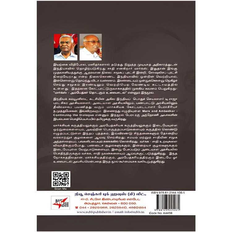 Details : Edition : 3 Category : Marxism ISBN : 9788123441061 Author : D. Raja, N. Muthumohan Weight : 100.00 gm Binding : Paper Back Language : Tamil Publishing Year : 2021 Pages : 236 Code no : A4459 மார்க்ஸ் – அம்பேத்கர் : இயற்கை விதிபோல, மனிதர்களால் தடுத்து நிறுத்த முடியாத அதிகாரத்துடன் இந்தியாவில் தொழிற்படுகிறது சாதி என்கிறார் மார்க்ஸ். இதுதான் இங்கு முதலாளியத்துக்கு ஆதரவான நிலை. சமூகப் புரட்சி இன்றி, சோஷலிசப் புரட்சி நிறைவேறாது என்ற நிலைகொண்ட இந்தியாவில் ஒன்றின் வெற்றியால், | இன்னொன்று தொய்ந்து விடா வண்ணம், இரண்டையும் ஒன்றுக்கொன்று நெகிழச் | செய்து சமூகம் இரண்டிலும் வெற்றி பெற வேண்டிய கட்டாயத்தில் உள்ளது. இதற்கான கோட்பாட்டுருவாக்கத்தில் முக்கிய கவனம் பெறுகிறது| “மார்க்ஸ் – அம்பேத்கர் தொடரும் உரையாடல்” என்னும் இந்நூல். இந்தியக் கம்யூனிஸ்ட் கட்சியின் அகில இந்தியப் பொதுச் செயலாளர் டி.ராஜா புரட்சிகர அரசியலாளர்; அடையாள அரசியலிலும், பண்பாட்டு அரசியலிலும் |தீவிரமாகப் பயணித்து வரும் மார்க்சியக் கோட்பாட்டாளர் பேராசிரியர் ந.முத்துமோகன். இவ்விருவரும் இணைந்து எழுதியுள்ள Marx and Ambedkar – | Continuing the Dialogue என்னும் இந்நூல் பேரா.ரகு அந்தோணி அவர்களின் | இயல்பான மொழிபெயர்ப்பில் தமிழுக்கு வருகிறது. மார்க்சியக் கருத்தியலுக்கும் அம்பேத்கரியக் கருத்தியலுக்கும் இடையேயுள்ள ஒற்றுமைகளையும், அவற்றின் பொருத்தப்பாடுகளையும் கருத்தில் கொண்டு எழுதப்பட்டுள்ள இந்தப் புத்தகம், இவ்விரண்டு சிந்தனைகளும் தோன்றிய வரலாற்றுச் சூழல்களை ஆய்வு செய்கிறது; சமயம் மற்றும் சாதியின் சமூக அந்தஸ்தையும், பங்களிப்பையும் கணக்கில் கொள்கிறது. வர்க்க – சாதி உறவுகளை விவாதிக்கும்போது, பண்டைச் சூழல்களுக்கும், இன்றையச் சூழல்களுக்கும் | இடையேயுள்ள வேறுபாடுகளையும், இன்று பேசப்படும் அடையாள அரசியலில் பொதிந்திருக்கும் வர்க்க, சாதி நலன்களையும் ஆய்வுக்குட்படுத்துகிறது. இந்த நோக்கத்தில்தான், மார்க்சியத்திற்கும், அம்பேத்கரியத்திற்கும் இடையே ஓர் உரையாடல் அவசியமென்பதை இந்த நூல் கூர்மையாக வலியுறுத்துகிறது. |