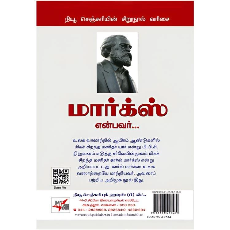 Details : Category : Sirunool Varisai ISBN : 9788123421469 Author : Editorial Board Weight : 100.00 gm Binding : Paper Back Language : Tamil Publishing Year : 2009 Pages : 24 Code no : A2514 மார்க்ஸ் என்பவர் : உலக வரலாற்றில் ஆயிரம் ஆண்டுகளில் மிகச் சிறந்த மனிதர் யார் என்று பி.பி.சி. நிறுவனம் எடுத்த சர்வேயின்மூலம் மிகச் சிறந்த மனிதர் கார்ல் மார்க்ஸ் என்று அறியப்பட்டது. கார்ல் மார்க்ஸ் உலக வரலாற்றையே மாற்றியவர். அவரைப் பற்றிய அறிமுக நூல் இது. |