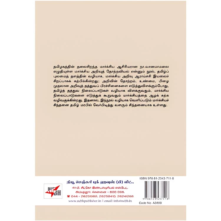 Details : Category : Marxism ISBN : 9788123437118 Author : Prof. N. Vanamamalai Weight : 100.00 gm Binding : Paper Back Language : Tamil Publishing Year : 2018 Code no : A3850 மார்க்சிய அறிவுத் தோற்றவியல் : தமிழகத்தின் தலைசிறந்த மார்க்சிய ஆசிரியரான நா.வானமாமலை எழுதியுள்ள மார்க்சிய அறிவுத் தோற்றவியல் என்னும் நூல், தமிழ்ப் புலமைத் தளத்தின் வழியாக, மார்க்சிய அறிவு ஆராய்ச்சி இயலைச் சிறப்பாகக் கற்பிக்கின்றது; அறிவின் தோற்றம், உண்மை, பிழை முதலான அறிவுத் தத்துவப் பிரச்சினைகளை எடுத்துவிளக்கும்போது. தமிழ்த் தத்துவ நிலைப்பாடுகள் வழியாக விளக்குவதும், மார்க்சிய நிலைப்பாடுகளை எடுத்துக் கூறுவதும் மார்க்சியத்தை ஆழக் கற்க வழிவகுக்கின்றது. இதனால், இந்நூல் வழியாக வெளிப்படும் மார்க்சியச் சிந்தனை தமிழ் மரபில் வேர்பிடித்து வளரும் சிந்தனையாக உள்ளது. |