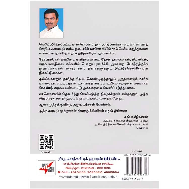 Details : 659ISBN : 9788123426716 Category : Essay Author : T. Stalin Gunasekaran Pages : 204 Language : Tamil Binding : Paper back Weight : 100 gm Publishing Year : 2014 Code : A3018 மெய்வருத்தக் கூலி தரும் : நெறிப்படுத்தப்பட்ட மனநிலையில் தன் அனுபவங்களையும் எண்ணத் தெறிப்புகளையும் எளிய நடையில் வானொலியில் தாம் பேசிய கருத்துகளை சுவையானதாக்கித் தொகுத்திருக்கிறார் நூலாசிரியர் மெய்வருத்தக் கூலி தரும் தேசபக்தி, நன்றியறிதல், மனிதாபிமானம், தேசத் தலைவர்கள், தியாகிகள், சமூக மனநிலை, மக்களின் பொறுப்புணர்ச்சி, அக்கறை, போற்றத்தக்க குணாம்சங்கள் என்று சகல திசைகளுக்கும் இட்டுச்செல்கின்றன இக்கட்டுரைகள். ஒவ்வொன்றும் தனித்த சிறப்பு கொண்டிருந்தாலும் அத்தனையும் மனித மாண்புகளையும் அதன் உன்னதத்தையும் உயிர்ப்பையும் மையமாகக் கொண்டு சமூகப் பண்பாட்டு அக்கறையை வெளிப்படுத்துபவை. வானொலியில் தொடர்ந்து செவிமடுத்த நிகழ்ச்சிதான் என்றாலும், அந்த சிற்றுரைகளை திரும்பவும் நூல் வடிவில் வாசித்த போது… ஆகா! முத்துக்குளித்த அனுபவம்தான் போங்கள். அத்தனையும் முத்துக்கள்; வெற்றுச்சிப்பிகள் ஏதும் இல்லை! ௧.பொ.சீநிவாசன் கூடுதல் தலைமை இயக்குநர் (ஓய்வு) அகில இந்திய வானொலி (தென் மண்டலம்) சென்னை |
