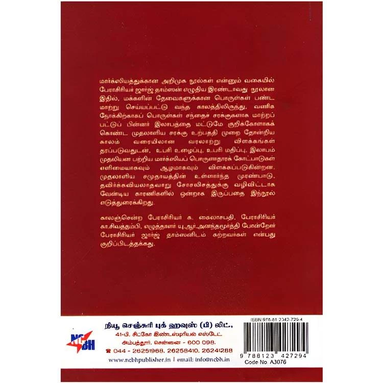 Details : Category : Articles Author : S. V. Rajadurai ISBN : 9788123427294 Weight : 100.00 gm Binding : Paper Back Language : Tamil Publishing Year : 2014 Pages : 176 Code no : A3076 முதலாளியமும் அதன் பிறகும் : மார்க்ஸியத்துக்கான அறிமுக நூல்கள் என்னும் வகையில் பேராசிரியர் ஜார்ஜ் தாம்ஸன் எழுதிய இரண்டாவது நூலான இதில், மக்களின் தேவைகளுக்கான பொருள்கள் பண்ட மாற்று செய்யப்பட்டு வந்த காலத்திலிருந்து, வணிக நோக்கிற்காகப் பொருள்கள் சந்தைச் சரக்குகளாக மாற்றப் பட்டுப் பின்னர் இலாபத்தை மட்டுமே குறிக்கோளாகக் கொண்ட முதலாளிய சரக்கு உற்பத்தி முறை தோன்றிய காலம் வரையிலான வரலாற்று விளக்கங்கள் தரப்படுவதுடன், உபரி உழைப்பு, உபரி மதிப்பு, இலாபம் முதலியன பற்றிய மார்க்ஸியப் பொருளாதாரக் கோட்பாடுகள் எளிமையாகவும் ஆழமாகவும் விளக்கப்படுகின்றன. முதலாளிய சமுதாயத்தின் உள்ளார்ந்த முரண்பாடு, தவிர்க்கவியலாதவாறு சோசலிசத்துக்கு வழிவிட்டாக வேன்டிய காரணிகளில் ஒன்றாக இருப்பதை இந்நூல் எடுத்துரைக்கிறது. காலஞ்சென்ற பேராசிரியர் க. கைலாசபதி, பேராசிரியர் கா.சிவத்தம்பி, எழுத்தாளர் யு.ஆர்.அனந்தமூர்த்தி போன்றோர் பேராசிரியர் ஜார்ஜ் தாம்ஸனிடம் கற்றவர்கள் என்பது குறிப்பிடத்தக்கது. |