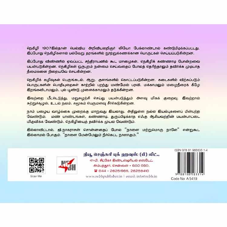Details : Author: சே.கோச்சடை Edition: 1st Edition ISBN: 978-81-985833-1-4 Category: Environment Binding: Paper Binding Language: Tamil Publishing Year: 2025 Pages: 72 Code No: A5419 நெகிழி : நெகிழி 1907இல்தான் பெல்ஜிய அறிவியலறிஞர் லியோ பேக்லாண்டால் கண்டுபிடிக்கப்பட்டது. இப்போது நெகிழிகளால் பல்வேறு தரங்களில் நூற்றுக்கணக்கான பொருட்கள் செய்யப்படுகின்றன. இப்போது விண்ணில் ஏவப்பட்ட சந்திராயனில் கூட மாழைகள், நெகிழிக் கண்ணாடி போன்றவை பயன்படுகின்றன. நெகிழிகள் ஒருபுறம் நன்மை செய்வதைப் போலத் தெரிந்தாலும் தவிர்க்க முடியாத தீமைகளை நிறையவே செய்கின்றன. நெகிழிக் கழிவுகள் பெருங்கடல், ஆறு, குளங்களில் கொட்டப்படுகின்றன. கடைகளில் விற்கப்படும் பொருட்களின் பொதியுறைகள் காற்றில் பறந்து மண்மேல் பரவி, மக்காமலும் மழைநீரைக் கீழே இறங்கவிடாமலும், புல் பூண்டு முளைக்காமலும் தடுக்கின்றன. இவற்றை மீட்டெடுத்து, மறுசுழற்சி செய்து பயன்படுத்தும் அளவு மிகக் குறைவு. இவற்றால் சுற்றுச்சூழல்,உடல் நலம், சமூகம் பெருமளவு சீர்கெடுகின்றன. + நாம் பழைய வாழ்க்கை முறைக்கு மாறுவது இயலாது. அதிலுள்ள நல்ல இயல்புகளைப் பின்பற்ற வேண்டும்.மண் பாண்டங்கள். கண்ணாடி. துருப்பிடிக்காத எஃகு ஆகியவற்றின் பயன்பாட்டை மிகுவிக்க வேண்டும். நெகிழியைத் தவிர்க்க முயல வேண்டும். இல்லாவிட்டால். ஜி.நாகராசன் சொன்னதைப் போல “நாளை மற்றுமொரு நாளே” என்றுகூட இல்லாமல் போகும். “நாளை மேன்மேலும் நீர்கெட்ட நாளாகும்.” |