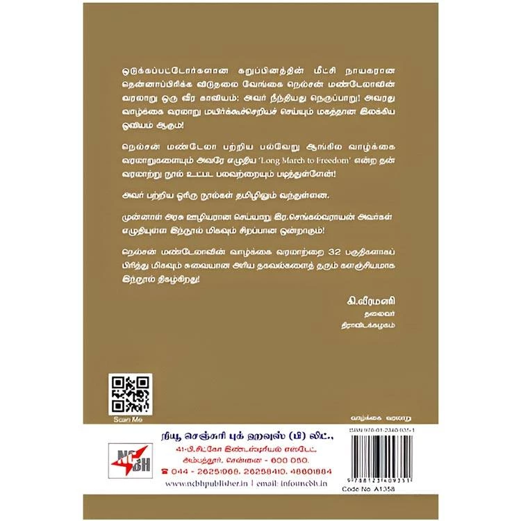 Details : Edition : 1 Category : History ISBN : 9788123409351 Author : R.Chengalvarayan Weight : 100.00 gm Binding : Paper Back Language : Tamil Publishing Year : 2006 Pages : 180 Code no : A1358 நெல்சன் மண்டேலா : ஒடுக்கப்பட்டோர்களான கறுப்பினத்தின் மீட்சி நாயகரான தென்னாப்பிரிக்க விடுதலை வேங்கை நெல்சன் மண்டேலாவின் வரலாறு ஒரு வீர காவியம்: அவர் நீந்தியது நெருப்பாறு! அவரது வாழ்க்கை வரலாறு மயிர்க்கூச்செறியச் செய்யும் மகத்தான இலக்கிய ஓவியம் ஆகும்! நெல்சன் மண்டேலா பற்றிய பல்வேறு ஆங்கில வாழ்க்கை வரலாறுகளையும் அவரே எழுதிய ‘Long March to Freedom’ என்ற தன் வரலாற்று நூல் உட்பட பலவற்றையும் படித்துள்ளேன்! அவர் பற்றிய ஓரிரு நூல்கள் தமிழிலும் வந்துள்ளன. முன்னாள் அரசு ஊழியரான செய்யாறு இர.செங்கல்வராயன் அவர்கள் எழுதியுள்ள இந்நூல் மிகவும் சிறப்பான ஒன்றாகும்! நெல்சன் மண்டேலாவின் வாழ்க்கை வரலாற்றை 32 பகுதிகளாகப் பிரித்து மிகவும் சுவையான அரிய தகவல்களைத் தரும் களஞ்சியமாக இந்நூல் திகழ்கிறது! கி.வீரமணி தலைவர் திராவிடக்கழகம். |