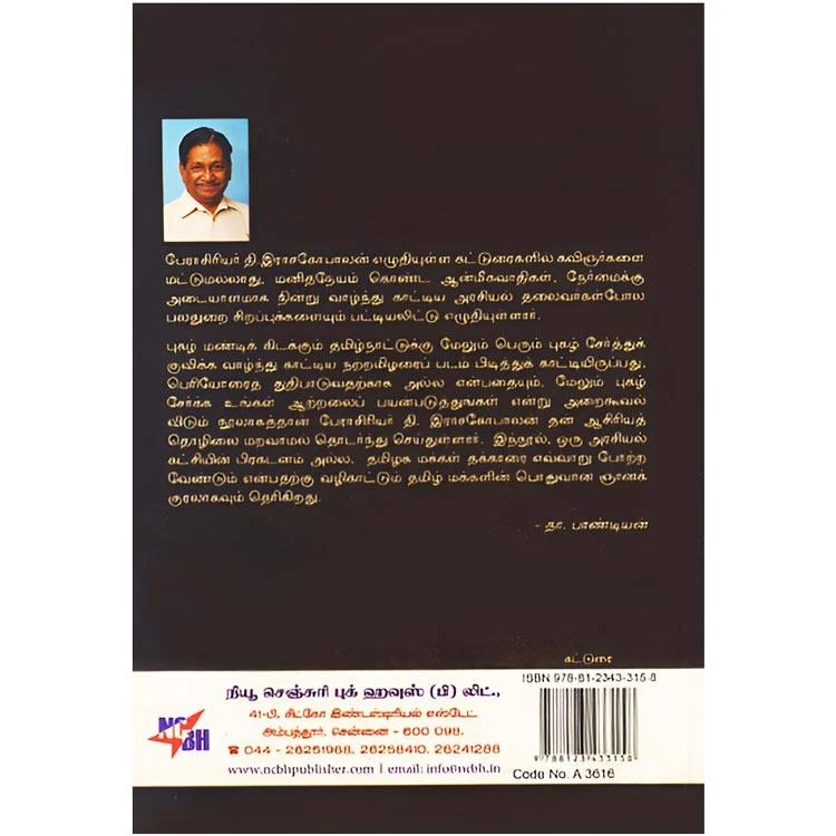 Details : Category : Essay ISBN : 9788123433158 Author : Prof. T. Rajagopalan Weight : 100.00 gm Binding : Paper Back Language : Tamil Publishing Year : 2019 Code no : A3616 Pages : 164 நெருஞ்சி மலர்கள் : பேராசிரியர் தி.இராசகோபாலன் எழுதியுள்ள கட்டுரைகளில் கவிஞர்களை மட்டுமல்லாது, மனிதநேயம் கொண்ட ஆன்மீகவாதிகள், நேர்மைக்கு அடையாளமாக நின்று வாழ்ந்து காட்டிய அரசியல் தலைவர்கள்போல பலதுறை சிறப்புக்களையும் பட்டியலிட்டு எழுதியுள்ளார். புகழ் மண்டிக் கிடக்கும் தமிழ்நாட்டுக்கு மேலும் பெரும் புகழ் சேர்த்துக் குவிக்க வாழ்ந்து காட்டிய நற்றமிழரைப் படம் பிடித்துக் காட்டியிருப்பது. பெரியோரைத் துதிபாடுவதற்காக அல்ல என்பதையும், மேலும் புகழ் சேர்க்க உங்கள் ஆற்றலைப் பயன்படுத்துங்கள் என்று அறைகூவல் விடும் நூலாகத்தான் பேராசிரியர் தி. இராசகோபாலன் தன் ஆசிரியத் தொழிலை மறவாமல் தொடர்ந்து செய்துள்ளார். இந்நூல், ஒரு அரசியல் கட்சியின் பிரகடனம் அல்ல. தமிழக மக்கள் தக்காரை எவ்வாறு போற்ற வேண்டும் என்பதற்கு வழிகாட்டும் தமிழ் மக்களின் பொதுவான ஞானக் குரலாகவும் தெரிகிறது. தா. பாண்டியன் |