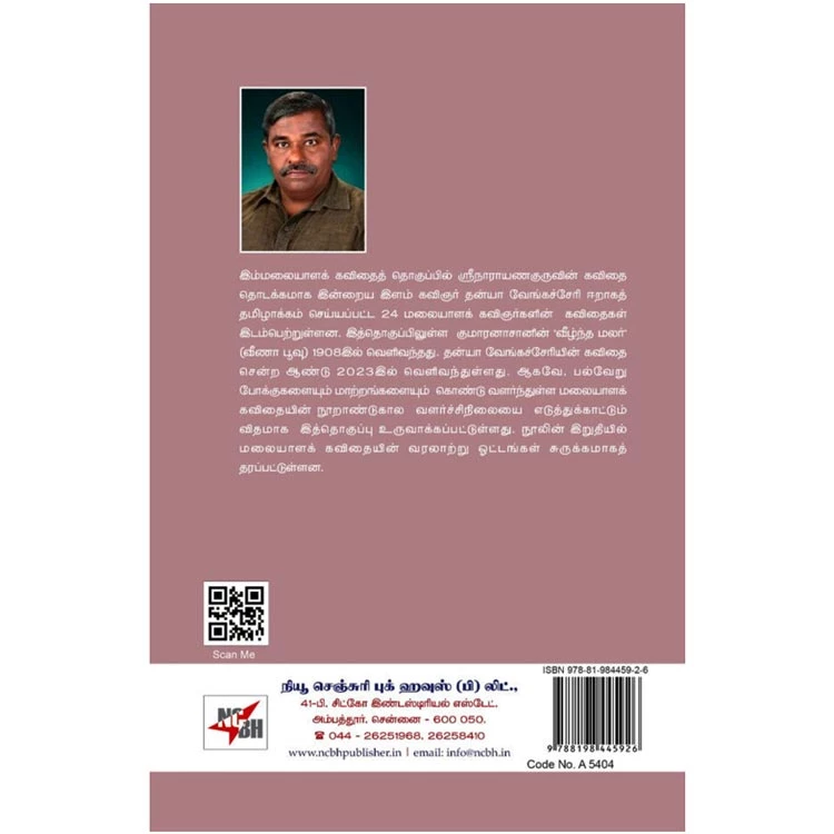 Details : Author: பா.ஆனந்தகுமார் Edition: 1st Edition ISBN: 978-81-984459-2-6 Category: Poetry Binding: Paper Binding Language: Tamil Publishing Year: 2025 Pages: 176 Code No: A5404 மலையாளக் கவிதைகள் : இம்மலையாளக் கவிதைத் தொகுப்பில் ஸ்ரீநாராயணகுருவின் கவிதை தொடக்கமாக இன்றைய இளம் கவிஞர் தன்யா வேங்கச்சேரி ஈறாகத் தமிழாக்கம் செய்யப்பட்ட 24 மலையாளக் கவிஞர்களின் கவிதைகள் இடம்பெற்றுள்ளன. இத்தொகுப்பிலுள்ள குமாரனாசானின் ‘வீழ்ந்த மலர்’ (வீணா பூவு) 1908இல் வெளிவந்தது. தன்யா வேங்கச்சேரியின் கவிதை சென்ற ஆண்டு 2023இல் வெளிவந்துள்ளது. ஆகவே, பல்வேறு போக்குகளையும் மாற்றங்களையும் கொண்டு வளர்ந்துள்ள மலையாளக் கவிதையின் நூறாண்டுகால வளர்ச்சிநிலையை எடுத்துக்காட்டும் விதமாக இத்தொகுப்பு உருவாக்கப்பட்டுள்ளது. நூலின் இறுதியில் மலையாளக் கவிதையின் வரலாற்று ஓட்டங்கள் சுருக்கமாகத் தரப்பட்டுள்ளன. |