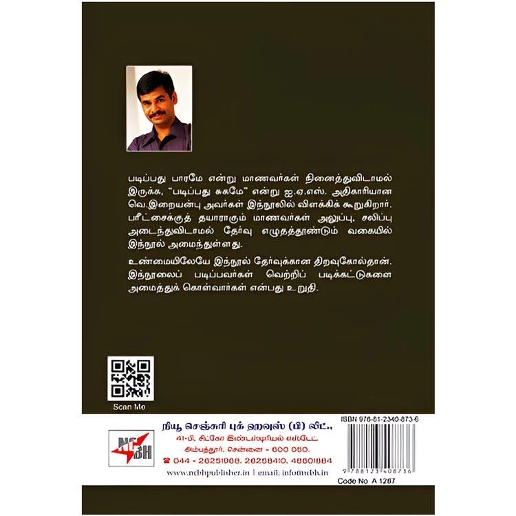 Details : Edition : 20 Category : Self Help ISBN : 9788123408736 Author : V. Iraianbu Weight : 100.00 gm Binding : Paper Back Language : Tamil Publishing Year : 2016 Pages : 128 Code no : A1287 படிப்பது சுகமே : படிப்பது பாரமே என்று மாணவர்கள் நினைத்துவிடாமல் இருக்க, “படிப்பது சுகமே” என்று ஐ.ஏ.எஸ். அதிகாரியான வெ.இறையன்பு அவர்கள் இந்நூலில் விளக்கிக் கூறுகிறார். பரீட்சைக்குத் தயாராகும் மாணவர்கள் அலுப்பு, சலிப்பு அடைந்துவிடாமல் தேர்வு எழுதத்தூண்டும் வகையில் இந்நூல் அமைந்துள்ளது. உண்மையிலேயே இந்நூல் தேர்வுக்கான திறவுகோல்தான். இந்நூலைப் படிப்பவர்கள் வெற்றிப் படிக்கட்டுகளை அமைத்துக் கொள்வார்கள் என்பது உறுதி. |
