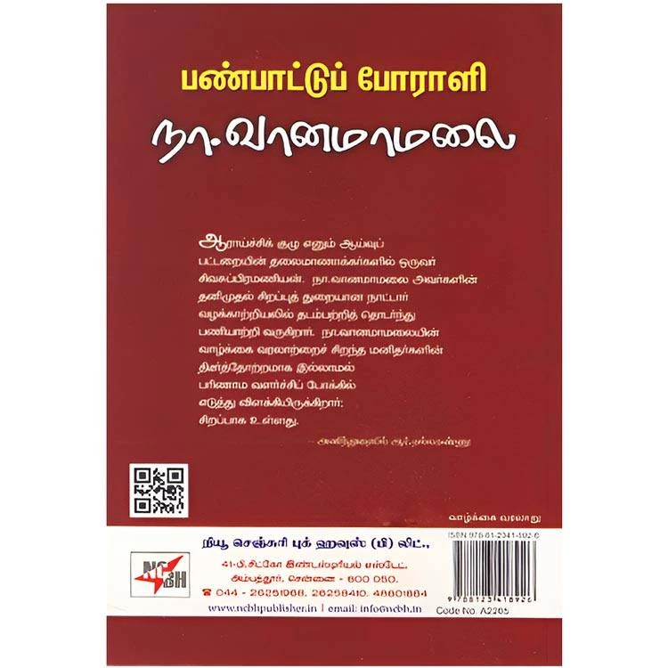 Details : ISBN : 9788123418926 Author : A. Sivasubramanian Weight : 100.00 gm Binding : Paper Back Language : Tamil Publishing Year : 2010 Code no : A2265 Pages : 166 பண்பாட்டுப் போராளி நா.வானமாமலை : ஆராய்ச்சிக் குழு எனும் ஆய்வுப் பட்டறையின் தலைமாணாக்கர்களில் ஒருவர் சிவசுப்பிரமணியன். நா.வானமாமலை அவர்களின் தனிமுதல் சிறப்புத் துறையான நாட்டார் வழக்காற்றியலில் தடம்பற்றித் தொடர்ந்து பணியாற்றி வருகிறார். நா.வானமாமலையின் வாழ்க்கை வரலாற்றைச் சிறந்த மனிதர்களின் திடீர்த்தோற்றமாக இல்லாமல் பரிணாம வளர்ச்சிப் போக்கில் எடுத்து விளக்கியிருக்கிறார்; சிறப்பாக உள்ளது. அணிந்துரையில் ஆர். நல்லகண்ணு |
