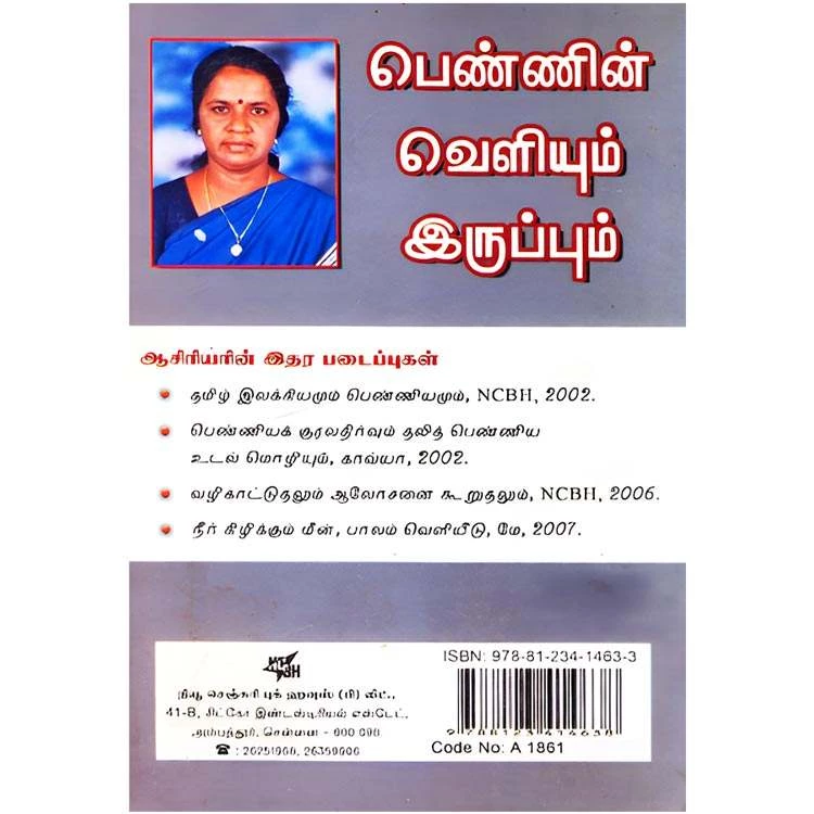 Details : Category : Essay ISBN : 9788123414633 Author : Aranga Mallika Weight : 100.00 gm Binding : Paper Back Language : Tamil Publishing Year : 2008 Pages : 112 Code no : A1861 பெண்ணின் வெளியும் இருப்பும் : தமிழ் இலக்கியமும் பெண்ணியமும், பெண்ணியக் குரலதிர்வும் தலித் பெண்ணிய உடல் மொழியும், காவ்யா, 2002. வழிகாட்டுதலும் ஆலோசனை கூறுதலும், நீர் கிழிக்கும் மீன், பாலம் வெளியீடு, மே, 2007. பெண்ணின் வெளியும் இருப்பும். |