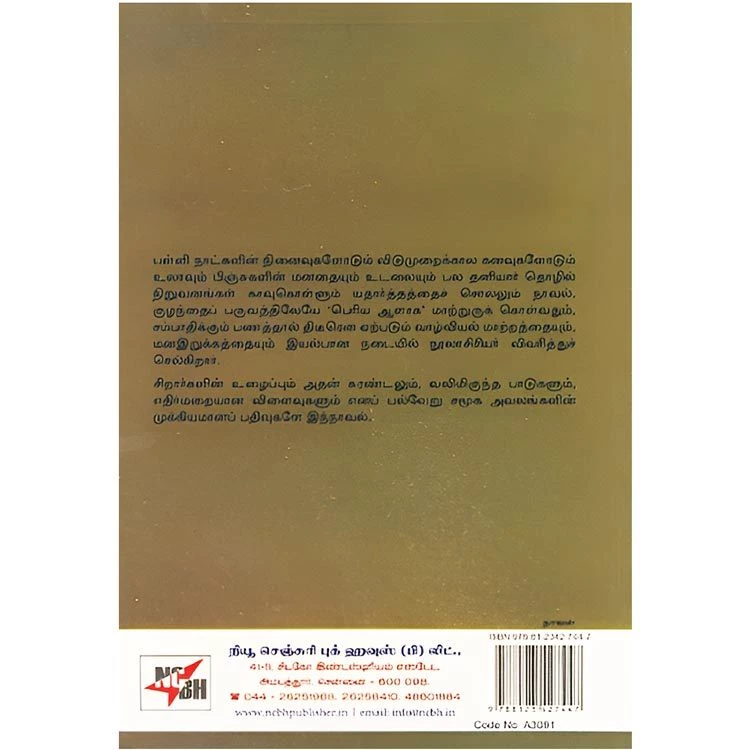 Details : Category : Novel ISBN : 9788123427447 Author : Subbrabharathi Manian Weight : 100.00 gm Binding : Paper Back Language : Tamil Publishing Year : 2016 Pages : 252 Code no : A3091 பிணங்களின் முகங்கள் : பள்ளி நாட்களின் நினைவுகளோடும் விடுமுறைக்கால கனவுகளோடும் உலாவும் பிஞ்சுகளின் மனதையும் உடலையும் பல தனியார் தொழில் நிறுவனங்கள் காவுகொள்ளும் யதார்த்தத்தைச் சொல்லும் நாவல். குழந்தைப் பருவத்திலேயே ‘பெரிய ஆளாக’ மாற்றுருக் கொள்வதும், சம்பாதிக்கும் பணத்தால் திடீரென ஏற்படும் வாழ்வியல் மாற்றத்தையும்,மனஇறுக்கத்தையும் இயல்பான நடையில் நூலாசிரியர் விவரித்துச் செல்கிறார். சிறார்களின் உழைப்பும் அதன் சுரண்டலும், வலிமிகுந்த பாடுகளும், எதிர்மறையான விளைவுகளும் எனப் பல்வேறு சமூக அவலங்களின் முக்கியமானப் பதிவுகளே இந்நாவல். |