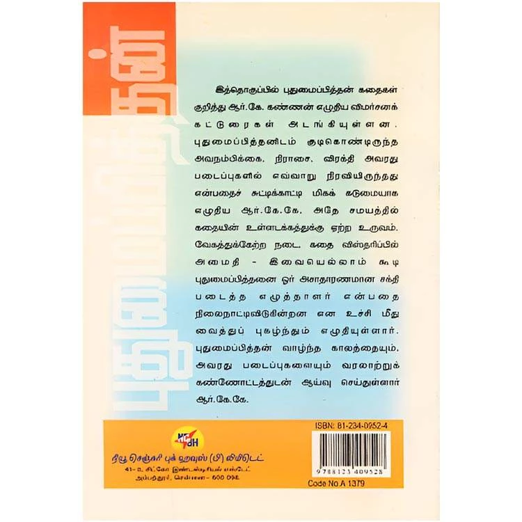 Details : ISBN : 9788123409528 Author : R.K. Kannan Weight : 100.00 gm Binding : Paper Back Language : Tamil Publishing Year : 2005 Code no : A1379 Pages : 66 புதுமைப்பித்தன் : இத்தொகுப்பில் புதுமைப்பித்தன் கதைகள் குறித்து ஆர்.கே. கண்ணன் எழுதிய விமர்சனக் கட்டுரைகள் அடங்கியுள்ளன. புதுமைப்பித்தனிடம் குடிகொண்டிருந்த அவநம்பிக்கை, நிராசை, விரக்தி அவரது படைப்புகளில் எவ்வாறு நிரவியிருந்தது என்பதைச் சுட்டிக்காட்டி மிகக் கடுமையாக எழுதிய ஆர்.கே.கே. அதே சமயத்தில் கதையின் உள்ளடக்கத்துக்கு ஏற்ற உருவம், வேகத்துக்கேற்ற நடை, கதை விஸ்தரிப்பில் அமைதி இவையெல்லாம் கூடி புதுமைப்பித்தனை ஓர் அசாதாரணமான சக்தி படைத்த எழுத்தாளர் என்பதை நிலைநாட்டிவிடுகின்றன என உச்சி மீது வைத்துப் புகழ்ந்தும் எழுதியுள்ளார். புதுமைப்பித்தன் வாழ்ந்த காலத்தையும். அவரது படைப்புகளையும் வரலாற்றுக் கண்ணோட்டத்துடன் ஆய்வு செய்துள்ளார் ஆர்.கே.கே. |