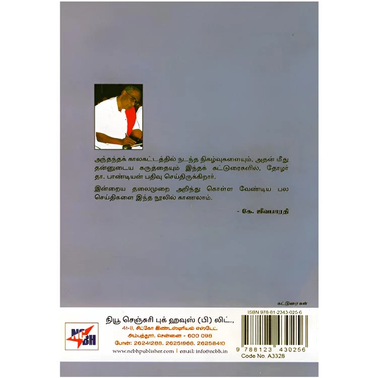 Details : Category : Articles Author : D. Pandian ISBN : 9788123430256 Weight : 100.00 gm Binding : Paper Back Language : Tamil Pages : 148 Publishing Year : 2015 Code no : A3328 ரத்தப் பொட்டும் ‘ரப்பர்’ அழிப்பும் : அந்தந்தக் காலகட்டத்தில் நடந்த நிகழ்வுகளையும், அதன் மீது தன்னுடைய கருத்தையும் இந்தக் கட்டுரைகளில், தோழர் தா. பாண்டியன் பதிவு செய்திருக்கிறார். இன்றைய தலைமுறை அறிந்து கொள்ள வேண்டிய பல செய்திகளை இந்த நூலில் காணலாம். |