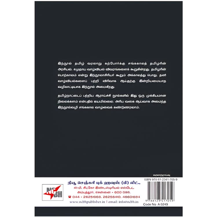 Details : ISBN : 9788123417059 Author : Dr. N. Subramanyan Weight : 100.00 gm Binding : Paper Back Language : Tamil Publishing Year : Code no : A249 சங்ககால வாழ்வியல் : இந்நூல் தமிழ் வரலாறு கற்போர்க்கு சங்ககாலத் தமிழரின் அரசியல், சமுதாய வாழ்வியல் விவரங்களைக் கூறுகின்றது. தமிழரின் பொற்காலம் என்று இந்நூலாசிரியர் கூறும் அக்காலத்து பொது. தனி வாழ்வியல்களைப் பற்றி விரிவாக ஆய்தற்கு இன்றியமையாத வழிகாட்டியாக இந்நூல் அமைகிறது. தமிழ்நாட்டைப் பற்றிய ஆராய்ச்சி நூல்களில் இது ஒரு முக்கியமான நிலைக்களம் என்பதில் ஐயமில்லை. அரிய வகை ஆய்வாக அமைந்த இந்நூல்வழி சங்ககால வாழ்வைக் கண்டுணரலாம். |