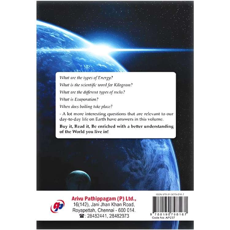 Details : Category : General Knowledge ISBN : 9788190798167 Author : S.Ananthakumar Weight : 100.00 gm Binding : Paper Back Language : English Publishing Year : 2013 Pages : 68 Code no : AP237 Science 1000 Informations : What are the types of Energy? What is the scientific word for Kilogram? What are the different types of rocks? What is Evaporation? When does boiling take place? -A lot more interesting questions that are relevant to our day-to-day life on Earth have answers in this volume. Buy it, Read it, Be enriched with a better understanding of the World you live in! |