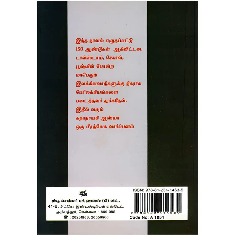Details : Category : Novel, Translation ISBN : 9788123414536 Author : Ivan Dhurganev Translator : N. Baskaran Weight : 100.00 gm Binding : Paper Back Language : Tamil Publishing Year : 2008 Pages : 104 Code no : A1851 சீமானின் திருமணம் : இந்த நாவல் எழுதப்பட்டு 150 ஆண்டுகள் ஆகிவிட்டன. டால்ஸ்டாய், செகாவ், பூஷ்கின் போன்ற மாபெரும் இலக்கியவாதிகளுக்கு நிகராக பேரிலக்கியங்களை படைத்தவர் துர்கநேவ். இதில் வரும் கதாநாயகி ஆஸ்யா ஒரு பிரத்யேக வார்ப்பனம் |