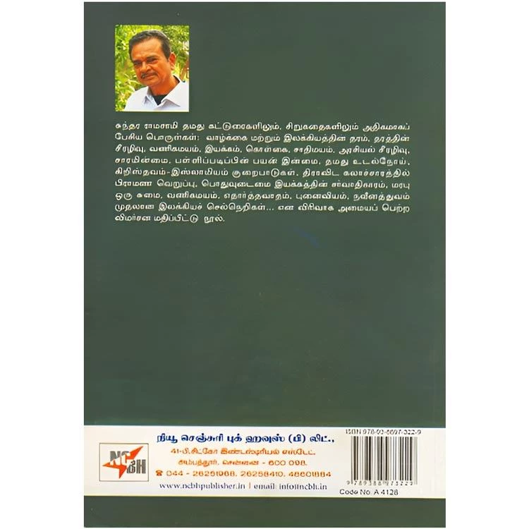 Details : ISBN : 9789388973229 Author : Raj Gauthaman Weight : 100.00 gm Binding : Paper Back Language : Tamil Publishing Year : 2018 Code no :A4128 சுந்தர ராமசாமி : சுந்தர ராமசாமி தமது கட்டுரைகளிலும், சிறுகதைகளிலும் அதிகமாகப் பேசிய பொருள்கள்: வாழ்க்கை மற்றும் இலக்கியத்தின் தரம், தரத்தின் சீரழிவு, வணிகமயம், இயக்கம், கொள்கை, சாதிமயம், அரசியல் சீரழிவு. சாரமின்மை, பள்ளிப்படிப்பின் பயன் இன்மை, தமது உடல்நோய், கிறிஸ்தவம்-இஸ்லாமியம் குறைபாடுகள். திராவிட கலாச்சாரத்தில் பிராமண வெறுப்பு, பொதுவுடைமை இயக்கத்தின் சர்வாதிகாரம், மரபு ஒரு சுமை, வணிகமயம், எதார்த்தவாதம், புனைவியம், நவீனத்துவம் முதலான இலக்கியச் செல்நெறிகள்… என விரிவாக அமையப் பெற்ற விமர்சன மதிப்பீட்டு நூல். |