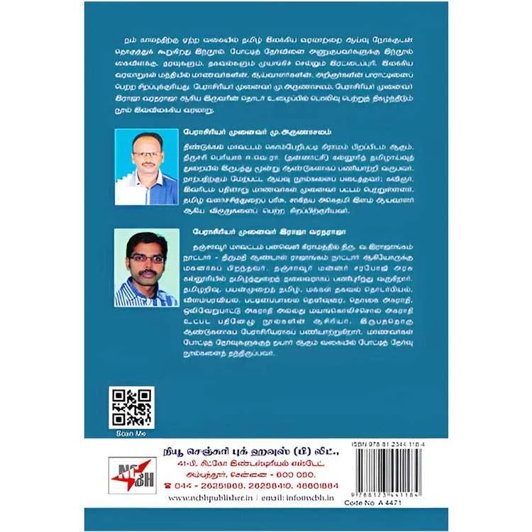 Details : ISBN : 9788123441184 Author : Dr. M. Arunachalam Weight : 100.00 gm TAMIL ILAKKIYA VARALAARU Binding : Paper Back Language : Tamil Publishing Year : 2021 Code no : A4471 தமிழ் இலக்கிய வரலாறு : நம் காலத்திற்கு ஏற்ற வகையில் தமிழ் இலக்கிய வரலாற்றை ஆய்வு நோக்குடன் தொகுத்துக் கூறுகிறது இந்நூல் போட்டித் தேர்வினை அணுகுபவர்களுக்கு இந்நூல் கைவிளக்கு, தரவுகளும், தகவல்களும் முயங்கிச் செல்லும் இரட்டைப்புரி. இலக்கிய வரலாறுகள் மத்தியில் மாணவர்களின், ஆய்வாளர்களின், அறிஞர்களின் பாராட்டினைப் பெற்ற சிறப்புக்குரியது. பேராசிரியர் முனைவர் மு,அருணாசலம், பேராசிரியர் முனைவர் இராஜா வரதராஜா ஆகிய இருவரின் தொடர் உழைப்பில் பொலிவு பெற்றுத் திகழ்ந்திடும் நூல் இவ்விலக்கிய வரலாறு. பேராசிரியர் முனைவர் மு.அருணாசலம் திண்டுக்கல் மாவட்டம் கொம்பேறிபட்டி கிராமம் பிறப்பிடம் ஆகும். திருச்சி பெரியார் ஈ.வெ.ரா. (தன்னாட்சி) கல்லூரித் தமிழாய்வுத் துறையில் இருபத்து மூன்று ஆண்டுகளாகப் பணியாற்றி வருபவர். நாற்பதிற்கும் மேற்பட்ட ஆய்வு நூல்களைப் படைத்தவர்: கவிஞர், இவரிடம் பதினாறு மாணவர்கள் முனைவர் பட்டம் பெற்றுள்ளனார். தமிழ் வளர்ச்சித்துறைப் பரிசு, சாகித்ய அகெதமி இளம் ஆய்வாளர் ஆகிய விருதுகளைப் பெற்ற சிறப்பிற்குரியவர். பேராசிரியர் முனைவர் இராஜா வரதராஜா தஞ்சாவூர் மாவட்டம் பனவெளி கிராமத்தில் திரு. வ.கிராஜாங்கம் நாட்டார் – திருமதி ஆண்டாள் ராஜாங்கம் நாட்டார் ஆகியோருக்கு மகனாகப் பிறந்தவர். தஞ்சாவூர் மன்னர் சரபோஜி அரசு கல்லூரியில் தமிழ்த்துறைத் தலைவராகப் பணிபுரிந்து வருகிறார். தமிழறிவு, பயன்முறைத் தமிழ் மக்கள் தகவல் தொடர்பியல், விளம்பரவியல், பட்டினப்பாமை தெளிவுரை. தொகை அகராதி. ஒலிவேறுபாட்டு அகராதி அல்லது மயங்கொலிச்சொல் அகராதி உட்பட பதினேமு நூல்களின் ஆசிரியர். இருபத்தொரு ஆண்டுகளாகப் பேராசிரியராகப் பணியாற்றுகிறார். மாணவர்கள் போட்டித் தேர்வுகளுக்குத் தயார் ஆகும் வகையில் போட்டித் தேர்வு நூல்களைத் தந்திருப்பவர். |