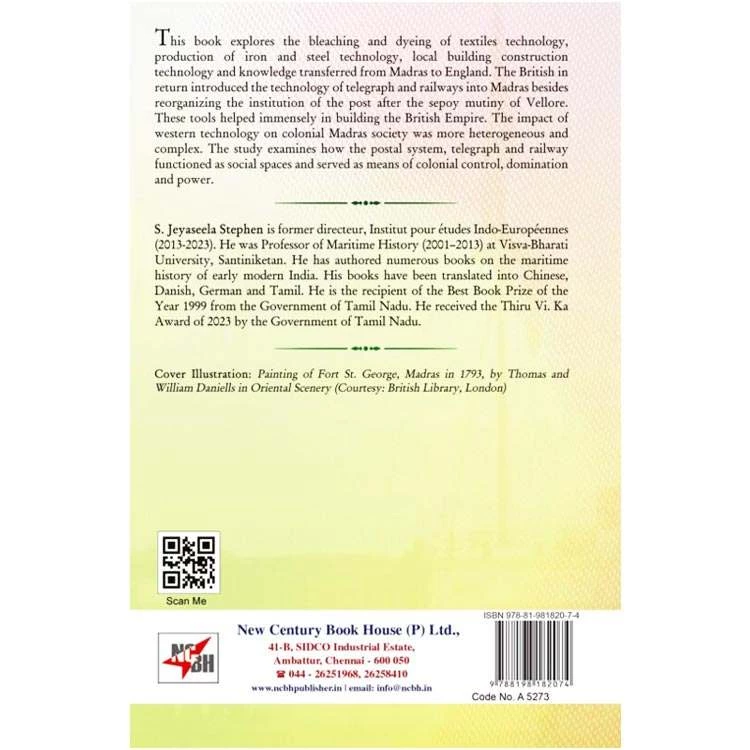 Details : Edition : 1 ISBN : 9788198182074 Category : History Author : Dr.K. Usha Krishnan,M.D,Phd., Weight : 100.00gm Binding : Paper Back Language : Tamil Publishing Year : 2024 Pages : 80 Code no : A5273 TECHNOLOGY TRANSFER AND BUILDING THE BRITISH EMPIRE IN MADRAS: COMMUNICATION AND SPEED, 1732-1898 This book explores the bleaching and dyeing of textiles technology, production of iron and steel technology, local building construction technology and knowledge transferred from Madras to England. The British in return introduced the technology of telegraph and railways into Madras besides reorganizing the institution of the post after the sepoy mutiny of Vellore. These tools helped immensely in building the British Empire. The impact of western technology on colonial Madras society was more heterogeneous and complex. The study examines how the postal system, telegraph and railway functioned as social spaces and served as means of colonial control, domination and power. Jeyaseela Stephen is former directeur, Institut pour études Indo-Européennes (2013-2023). He was Professor of Maritime History (2001-2013) at Visva-Bharati University, Santiniketan. He has authored numerous books on the maritime history of early modern India. His books have been translated into Chinese, Danish, German and Tamil. He is the recipient of the Best Book Prize of the Year 1999 from the Government of Tamil Nadu. He received the Thiru Vi. Ka Award of 2023 by the Government of Tamil Nadu. |
