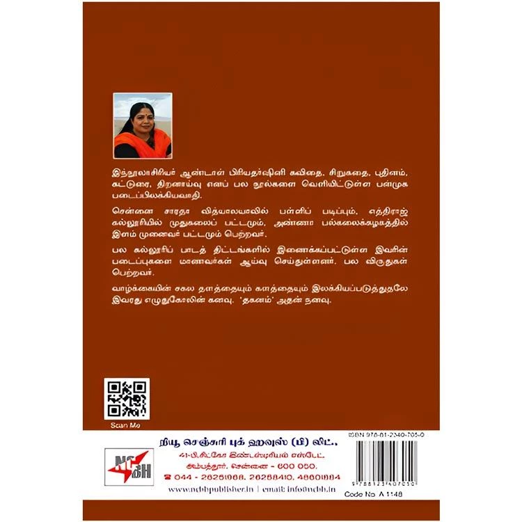 Details : ISBN : 9788123407050 Author : Andal Priyadarshini Weight : 100.00 gm Binding : Paper Back Language : Tamil Publishing Year : Code no : A1148 தகனம் : இந்நூலாசிரியர் ஆண்டாள் பிரியதர்ஷினி கவிதை, சிறுகதை, புதினம், கட்டுரை, திறனாய்வு எனப் பல நூல்களை வெளியிட்டுள்ள பன்முக படைப்பிலக்கியவாதி, சென்னை சாரதா வித்யாலயாவில் பள்ளிப் படிப்பும், எத்திராஜ் கல்லூரியில் முதுகலைப் பட்டமும், அண்ணா பல்கலைக்கழகத்தில் இளம் முனைவர் பட்டமும் பெற்றவர். பல கல்லூரிப் பாடத் திட்டங்களில் இணைக்கப்பட்டுள்ள இவரின் படைப்புகளை மாணவர்கள் ஆய்வு செய்துள்ளனர், பல விருதுகள் பெற்றவர். வாழ்க்கையின் சகல தளத்தையும் களத்தையும் இலக்கியப்படுத்துதலே இவரது எழுதுகோலின் கனவு. ‘தகனம்’ அதன் நனவு.