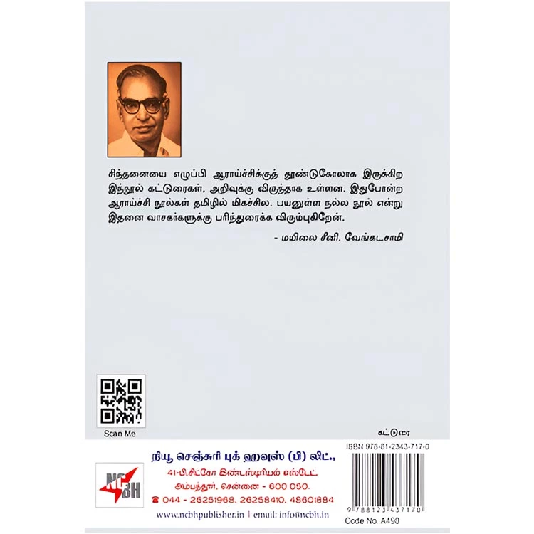 Details : ISBN : 9788123437170 Author : Prof. N. Vanamamalai Weight : 100.00 gm Binding : Paper Back Language : Tamil Publishing Year : 2017 Code no : A490 தமிழர் பண்பாடும் தத்துவமும் : சிந்தனையை எழுப்பி ஆராய்ச்சிக்குத் தூண்டுகோலாக இருக்கிற இந்நூல் கட்டுரைகள், அறிவுக்கு விருந்தாக உள்ளன. இதுபோன்ற ஆராய்ச்சி நூல்கள் தமிழில் மிகச்சில. பயனுள்ள நல்ல நூல் என்று இதனை வாசகர்களுக்கு பரிந்துரைக்க விரும்புகிறேன். மயிலை சீனி. வேங்கடசாமி |