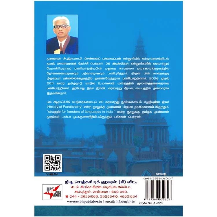 Details : ISBN : 9789388050807 Author : Prof. A. Ramasamy Weight : 100.00 gm Tharkkala Thamizhnattu Varalaru Binding : Paper Back Language : Tamil Publishing Year : 2018 Code no : A4035 தற்காலத் தமிழ்நாட்டு வரலாறு : முனைவர் அ.இராமசாமி. சென்னைப் பச்சையப்பன் கல்லூரியில் எம்.ஏ.ஜலாற்றியல் முதல் மாணவராகத் தேர்ச்சி பெற்றார். 25 ஆண்டுகள் கல்லூரிகளில் வரலாற்றுப் பேராசிரியராகப் பணியாற்றியபின் மதுரை காமராசர் பல்கலைக்கழகத்தில் தேர்வாணையராகவும் பதிவாளராகவும் பணிபுரிந்தார். அதன் பின் காரைக்குடி அழகப்பா பல்கலைக்கழகத்தில் துணைவேந்தராக பணியாற்றினார். 2005 முதல் 2011 வரை தமிழ்நாடு மாநில உயர்கல்வி மன்றத்தின் துணைத்தலைவராகப் பணியாற்றினார். தற்போது இவர் திராவிட வரவற்று ஆய்வு மையத்தின் தலைவராக இருக்கின்றார். பல ஆராய்ச்சிக் கட்டுரைகளையும் 20 வரலாற்று நூல்களையும் எழுதியுள்ள இவர் History of Pondicherry என்ற நூலுக்கு முன்னாள் பிரதமர் நரசிம்மாராவிடமிருந்தும். ‘struggle for freedom of languages in india’ என்ற நூலுக்கு தமிழக முன்னாள் முதல்வர் டாக்டர் மு.கருணாநிதியிடமிருந்தும் பரிசுகள் பெற்றார். |