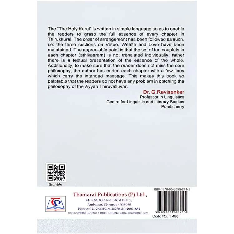 Details : Category : Thirukkural ISBN : 9789385982415 Author : Dr. A. Rajamanickam Weight : 100.00 gm Binding : Paper Back Language : English Publishing Year : 2023 Code no : T490 The Holy Kural : The “The Holy Kural” is written in simple language so as to enable the readers to grasp the full essence of every chapter in Thirukkural. The order of arrangement has been followed as such, i.e: the three sections on Virtue, Wealth and Love have been maintained. The appreciable point is that the set of ten couplets in each chapter (athikaaram) is not translated individually, rather there is a textual presentation of the essence of the whole. Additionally, to make sure that the reader does not miss the core philosophy, the author has ended each chapter with a few lines which carry the intended message. This makes this book so palatable that the readers do not have any problem in catching the philosophy of the Ayyan Thiruvalluvar. Dr. G.Ravisankar Professor in Linguistics Centre for Linguistic and Literary Studies Pondicherry |