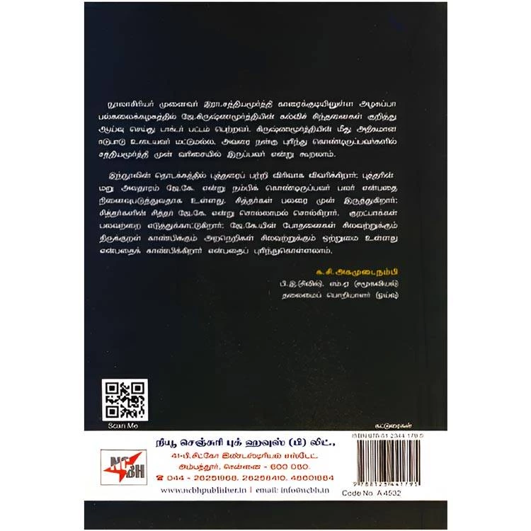 Details : ISBN : 9788123441795 Author : Prof. R. Sathyamoorthy Weight : 100.00 gm Binding : Paper Back Language : Tamil Publishing Year : 2021 Code no : A4532 Pages: 136 தேடலும் தெளிதலும் : நூலாசிரியர் முனைவர் இரா.சத்தியமூர்த்தி காரைக்குடியிலுள்ள அழகப்பா பல்கலைக்கழகத்தில் ஜே.கிருஷ்ணமூர்த்தியின் கல்விச் சிந்தனைகள் குறித்து ஆய்வு செய்து டாக்டர் பட்டம் பெற்றவர். கிருஷ்ணமூர்த்தியின் மீது அதிகமான ஈடுபாடு உடையவர் மட்டுமல்ல, அவரை நன்கு புரிந்து கொண்டிருப்பவர்களில் சத்தியமூர்த்தி மூன் வரிசையில் இருப்பவர் என்று கூறலாம். இந்நூலின் தொடக்கத்தில் புத்தரைப் பற்றி விரிவாக விவரிக்கிறார்; புத்தரின் மறு அவதாரம் ஜே.கே. என்று நம்பிக் கொண்டிருப்பவர் பலர் என்பதை நினைவுபடுத்துவதாக உள்ளது. சித்தர்கள் பலரை முன் இருத்துகிறார்; சித்தர்களின் சித்தர் ஜே.கே. என்று சொல்லாமல் சொல்கிறார். குறட்பாக்கள் பலவற்றை எடுத்துக்காட்டுகிறார்; ஜே.கே.யின் போதனைகள் சிலவற்றுக்கும் திருக்குறள் காண்பிக்கும் அறநெறிகள் சிலவற்றுக்கும் ஒற்றுமை உள்ளது என்பதைக் காண்பிக்கிறார் என்பதைப் புரிந்துகொள்ளலாம், க.சி.அகமுடைநம்பி பி.இ.(சிவில், எம்.ஏ (சமூகவியல் தலைமைப் பொறியாளர் (ஓய்ஷி |
