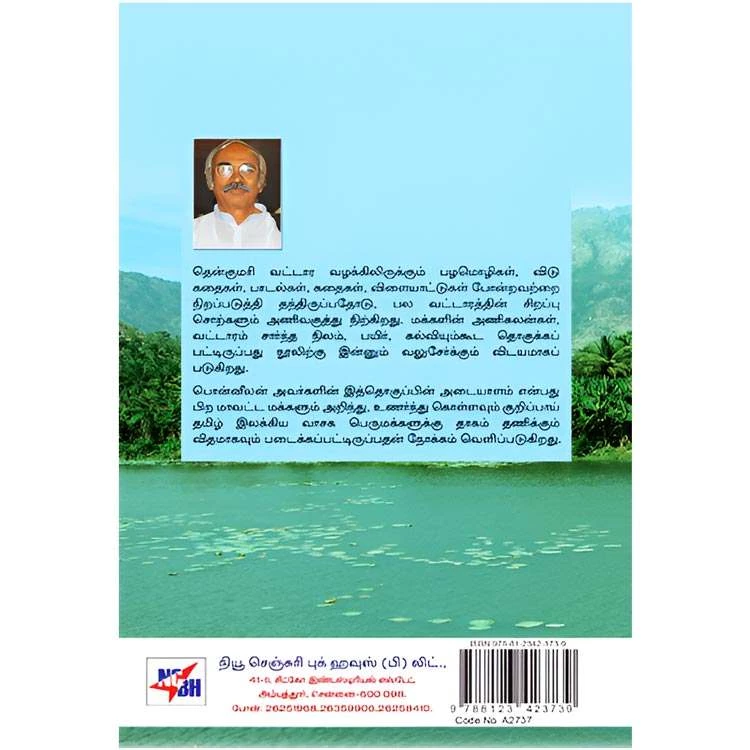 Details : ISBN : 9788123423739 Author : Ponneelan Weight : 100.00 gm Binding : Paper Back Language : Tamil Publishing Year : 2013 Code no : A2737 தென்குமரி வட்டார வழக்குகள் : தென்குமரி வட்டார வழக்கிலிருக்கும் பழமொழிகள். விடு கதைகள், பாடல்கள், கதைகள், விளையாட்டுகள் போன்றவற்றை நிறப்படுத்தி தந்திருப்பதோடு, பல வட்டாரத்தின் சிறப்பு சொற்களும் அணிவகுத்து நிற்கிறது. மக்களின் அணிகலன்கள், வட்டாரம் சார்ந்த நிலம், பயிர், கல்வியும்கூட தொகுக்கப் பட்டிருப்பது நூலிற்கு இன்னும் வலுசேர்க்கும் விடயமாகப் படுகிறது. பொன்னீலன் அவர்களின் இத்தொகுப்பின் அடையாளம் என்பது பிற மாவட்ட மக்களும் அறிந்து, உணர்ந்து கொள்ளவும் குறிப்பாய் தமிழ் இலக்கிய வாசக பெருமக்களுக்கு தாகம் தணிக்கும் விதமாகவும் படைக்கப்பட்டிருப்பதன் நோக்கம் வெளிப்படுகிறது. |