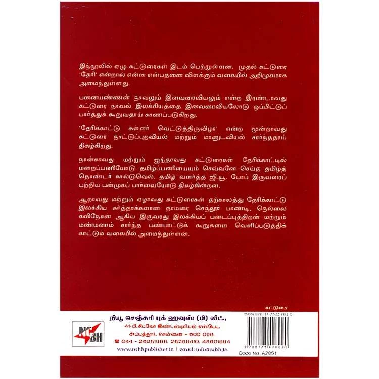 Details : Category : Essay ISBN : 9788123426020 Author : Dr.V. Gopala Krishnan Weight : 100.00 gm Binding : Paper Back Language : Tamil Publishing Year : 2017 Pages : 106 Code no : A2951 தேரிக்காட்டு இலக்கியங்கள் : இந்நூலில் ஏழு கட்டுரைகள் இடம் பெற்றுள்ளன. முதல் கட்டுரை “தேரி” என்றால் என்ன என்பதனை விளக்கும் வகையில் அறிமுகமாக அமைந்துள்ளது. பனையண்ணன் நாவலும் இனவரைவியலும் என்ற இரண்டாவது கட்டுரை நாவல் இலக்கியத்தை இனவரைவியலோடு ஒப்பிட்டுப் பார்த்துக் கூறுவதாய் காணப்படுகிறது. ‘தேரிக்காட்டு கள்ளர் வெட்டுத்திருவிழா’ என்ற மூன்றாவது கட்டுரை நாட்டுப்புறவியல் மற்றும் மானுடவியல் சார்ந்ததாய் திகழ்கிறது. நான்காவது மற்றும் ஐந்தாவது கட்டுரைகள் தேரிக்காட்டில் மறைப்பணியோடு தமிழ்ப்பணியையும் செவ்வனே செய்த தமிழ்த் தொண்டர் கால்டுவெல், தமிழ் வளர்த்த ஜி.யூ. போப் இருவரைப் பற்றிய பன்முகப் பார்வையோடு திகழ்கின்றன. ஆறாவது மற்றும் ஏழாவது கட்டுரைகள் தற்காலத்து தேரிக்காட்டு இலக்கிய கர்த்தாக்களான தாமரை செந்தூர் பாண்டி, நெல்லை. கவிநேசன் ஆகிய இருவரது இலக்கியப் படைப்புத்திறன் மற்றும் மண்மணம் சார்ந்த பண்பாட்டுக் கூறுகளை வெளிப்படுத்திக் காட்டும் வகையில் அமைந்துள்ளன. |