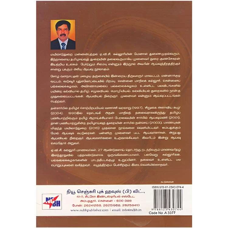 Details : ISBN : 9788123430744 Author : Prof. Durai. Gunasekaran Weight : 100.00 gm Binding : Paper Back Language : Tamil Publishing Year : 2015 Code no : A3377 Pages : 140 உலகம் போற்றும் சிலம்பு : மயிலாடுதுறை மன்னன்பந்தல் ஏ.வி.சி. கல்லூரியின் மேனாள் துணைமுதல்வரும், இந்நாளைய தமிழாய்வுத் துறையின் தலைவருமாகிய முனைவர் துரை குணசேகரன் இயற்றிய உலகம் போற்றும் சிலம்பு என்னும் இந்நூல் அவரின் ஆய்வுச்சிறத்திற்குச் சான்று பகரும் அரிய ஆய்வு நூலாகும். சோழ வாறாட்டின் பழைய தஞ்சையில் இன்றைய திருவாரூர் மாவட்டம், மன்னார்குடி வட்டம், வடுவூர் புதுக்கோட்டையில் பிறப்பு. சென்னை மாநிலக் கல்லூரி, சென்னைப் பல்கலைக்கழகம், அண்ணாமலைப் பல்கனலக்கழகம் உள்ளிட்ட பலவிடங்களில் பயின்ற கல்வியால் தமிழ், சமூகவியல், மொழியியல், கல்வியியல் துறைகளில் நான்கு முதுகலைப்பட்டங்கள். ஆய்வியல் நிறைஞர், முனைவர் என்னும் ஆய்வுப்பட்டங்கள் பெற்றவர். தன்சார்பில் தமிழ்ச் சொற்பிறப்பியல் வளர்ச்சி வரலாறு (1997). சிறுகை அளாவிய கூழ் (2004). 1990இல் தொடங்கி அதன் மாநிலத் தலைவராகவிருந்து தமிழ்ப் பணியாற்றிவரும் தமிழ் ஆராய்ச்சியாளர் பேரவையின் சார்பில் ஆய்வுமணிணி (2001), தான் பணியாற்றுகின்ற தமிழாய்வுத் துறையின் சார்பில் நன்செய் (2003), மாண்புகள் மிகுந்த மயிலாடுதுறை (2015) முதலான நூல்களை வெளியிட்டவர், ஈம்பதுக்கும் மேல் ஆய்வுக் கட்டுரைகள். பன்னிரு முனைவர் பட்ட ஆய்வாளர்கள், அறுபது ஆய்வியல் நிறைஞர் ஆய்வாளர்களை உருவாக்கியவர், இவரிடம் இன்று ஆய்வு செய்தோர் அறுவர். ஏ.வி.சி. கல்லூரி மாணவர்கள். 27 ஆண்டுகளாய் தொடர்ந்து நடத்திவரும் மாணவரிதழ் இளந்தூதுவில் பத்தாண்டுகளாக ஒருங்கிணைப்பாளர், பல்வேறு கல்லூரிகள், பல்கலைக்கழகங்களின் பாடத்திட்டக்குழு உறுப்பினர். தலைவர் உள்ளீட்ட பல பொறுப்புகளை வகித்தவர். எழுத்திற்கும் பேச்சிற்கும் இடைவெளியில்லாதவர். |