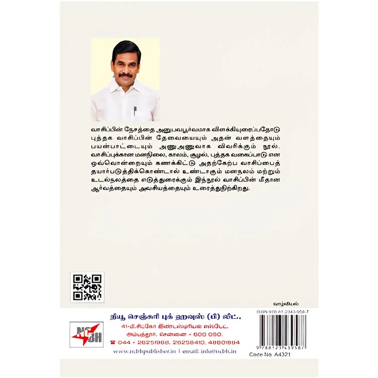 Details : ISBN : 9788123439587 Author : V.iraianbu Weight : 100.00gm Binding : paper back Language : Tamil Publishing Year : 2020 code no : A4321 வாசித்தல் : வாசிப்பின் நேசத்தை அனுபவபூர்வமாக விளக்கியுரைப்பதோடு புத்தக வாசிப்பின் தேவையையும் அதன் வளத்தையும் பயன்பாட்டையும் அணுஅணுவாக விவரிக்கும் நூல். வாசிப்புக்கான மனநிலை, காலம், சூழல், புத்தக வகைப்பாடு என ஒவ்வொன்றையும் கணக்கிட்டு அதற்கேற்ப வாசிப்பைத் தயார்படுத்திக்கொண்டால் உண்டாகும் மனநலம் மற்றும் உடல்நலத்தை எடுத்துரைக்கும் இந்நூல் வாசிப்பின் மீதான ஆர்வத்தையும் அவசியத்தையும் உணர்த்தும். |