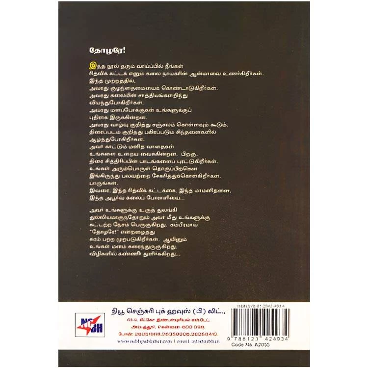 Details : ISBN : 9788123424934 Author : I. Shanmukadas Translator : Yuma Vasuki Weight : 100.00 gm Binding : Paper Back Language : Tamil Publishing Year : 2013 Pages : 144 Code no : A2855 வனத்திற்கும் நதிக்கும் செல்லும்போது : இந்த நூல் தரும் வாய்ப்பில் நீங்கள் ரித்விக் கட்டக் எனும் கலை நாயகரின் ஆன்மாவை உணர்கிறீர்கள். இந்த முற்றத்தில்,அவரது குழந்தைமையைக் கொண்டாடுகிறீர்கள். அவரது கலையின் சாத்தியங்களறிந்து வியந்துபோகிறீர்கள். அவரது மனப்போக்குகள் உங்களுக்குப் புதிராக இருக்கின்றன. அவரது வாழ்வு குறித்து சஞ்சலம் கொள்ளவும் கூடும். திரைப்படம் குறித்து பகிரப்படும் சிந்தனைகளில் ஆழ்ந்துபோகிறீர்கள். அவர் காட்டும் மனித வாதைகள் உங்களை உறைய வைக்கின்றன. பிறகு, திரை சித்திரிப்பின் பாடங்களைப் புரட்டுகிறீர்கள். உங்கள் அரும்பொருள் தொகுப்பிற்கென இங்கிருந்து பலவற்றை சேகரித்துக்கொள்கிறீர்கள். பாருங்கள். இவரை. இந்த ரித்விக் கட்டக்கை, இந்த மாமனிதனை, இந்த அபூர்வ கலைப் போராளியை… அவர் உங்களுக்கு உருத் துலங்கி துல்லியமாகுந்தோறும் அவர் மீது உங்களுக்கு, கட்டற்ற நேசம் பெருகுகிறது. கம்பீரமாய் “தோழரே!” என்றழைத்து கரம் பற்ற முற்படுகிறீர்கள். ஆயினும் உங்கள் மனம் கரைந்துருகுகிறது. விழிகளில் கண்ணீர் துளிர்க்கிறது… |
