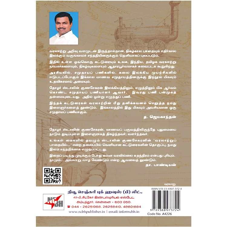 Details : ISBN : 9789388973724 Author : Stalin Gunasekaran Weight : 100.00 gm Binding : Paper back Language : Tamil Publishing Year : 2019 Code no : A4226 Pages : 476 வரலாற்றுப் பாதையில் : வரலாற்று அறிவு வளமுடன் இருந்தால்தான். நிகழ்கால பாதையும் எதிர்கால இலக்கும் வருங்காலச் சந்ததியினருக்கும் தெளிவாகப் புலப்படும். இதில் உள்ள ஒவ்வொரு கட்டுரையும் உலக, இந்திய, தமிழக வரலாற்று நாயகர்களையும், நிகழ்வுகளையும் ஆதாரபூர்வமாகச் சுவைபடக் கூறுகிறது. அரசியலில், சமுதாயப் பணிகளில். கலை இலக்கிய முயற்சிகளில் ஈடுபடப்போரும் இக்கால மாணவ சமுதாயத்தினருக்கு இந்நூல் மிகவும் உதவிகரமாய் அமையும். ர்வம் தோழர் ஸ்டாலின் குணசேகரன் இலக்கியத்திலும், எழுத்திலும் மிக ஆர் கொண்ட சமுதாயப் பணியாளர் ஆவார். இவரது பணி பன்முகத் தன்மையுடையது. அதில் ஒன்று எழுத்துப் பணி. இந்தக் கட்டுரைகள் வரலாற்றின் மீது தனிக்கவனம் செலுத்த நமது இளைஞர்களைத் தூண்டும். இக்காலத்தில் இது மிகவும் அவசியமான ஒரு சமுதாயப் பணியாகும். த. ஜெயகாந்தன் தோழர் ஸ்டாலின் குணசேகரன், மாணவப் பருவத்திலிருந்தே புதுமையை நாடும் துடிப்புள்ள இளைஞராகத் திகழ்ந்தவர்; வளர்ந்தவர். உங்கள் கைகளில் தவழும் ஸ்டாலின் குணசேகரனின் ‘வரலாற்றுப் பாதையில்…’ என்ற தலைப்பில் வெளியான கட்டுரைகளின் தொகுப்பு, நமது இளம் சந்ததிக்காக எழுதப்பட்டது. இதைப் படித்து முடிக்கும் போது சும்மா வரவில்லை சுதந்திரம் என்பது புரியும். நாமும்… அவ்வாறு வாழ வேண்டும் என்ற ஆவலைத் தூண்டும். தா.பாண்டியன் |