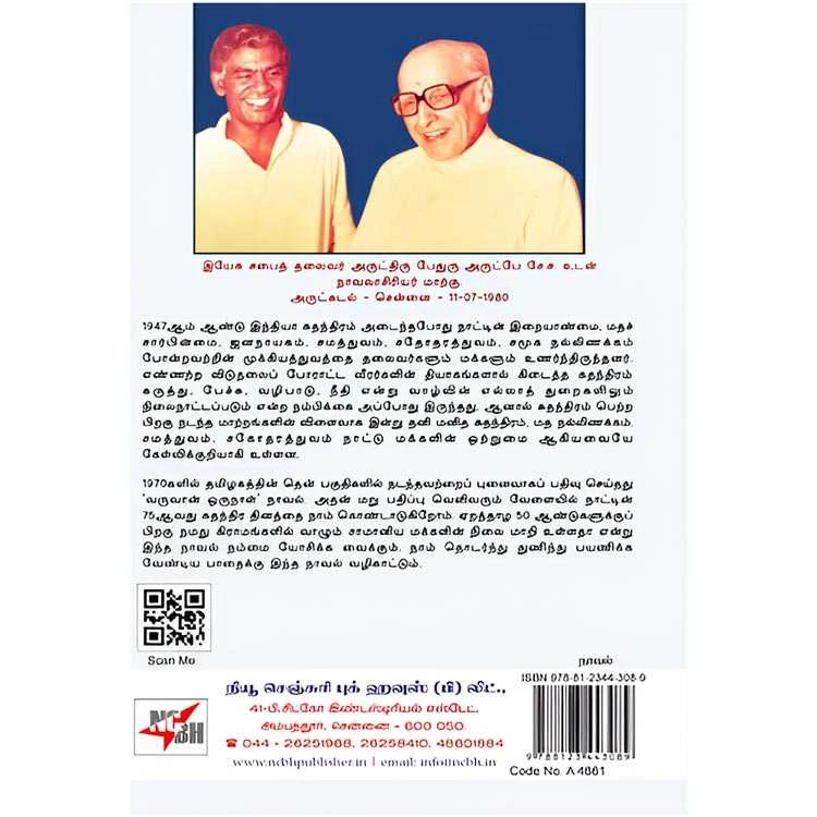 Details : Category : Novel ISBN : 9788123443089 Author : Mark Weight : 100.00gm Binding : Paper Back Language : Tamil Publishing Year : 2022 Pages : 230 Code no : A4661 வருவான் ஒருநாள் : 1947ஆம் ஆண்டு இந்தியா சுதந்திரம் அடைந்தபோது நாட்டின் இறையாண்மை, மதச் சார்பின்மை, ஜனநாயகம், சமத்துவம், சதோதரத்துவம், சமூக நல்லிணக்கம் போன்றவற்றின் முக்கியத்துவத்தை தலைவர்களும் மக்களும் உணர்ந்திருந்தனர். எண்ணற்ற விடுதலைப் போராட்ட வீரர்களின் தியாகங்களால் கிடைத்த சுதந்திரம் கருத்து. பேச்சு, வழிபாடு. நீதி என்று வாழ்வின் எல்லாத் துறைகளிலும் நிலைநாட்டப்படும் என்ற நம்பிக்கை அப்போது இருந்தது. ஆனால் சுதந்திரம் பெற்ற பிறகு நடந்த மாற்றங்களின் விளைவாக இன்று தனி மனித சுதந்திரம், மத நல்லிணக்கம், சமத்துவம், சகோதரத்துவம் நாட்டு மக்களின் ஒற்றுமை ஆகியவையே கேள்விக்குறியாகி உள்ளன. 1970களில் தமிழகத்தின் தென் பகுதிகளில் நடந்தவற்றைப் புனைவாகப் பதிவு செய்தது ‘வருவான் ஒருநாள்’ நாவல். அதன் மறு பதிப்பு வெளிவரும் வேளையில் நாட்டின் 75ஆவது சுதந்திர தினத்தை நாம் கொண்டாடுகிறோம். ஏறத்தாழ 50 ஆண்டுகளுக்குப் பிறகு நமது கிராமங்களில் வாழும் சாமானிய மக்களின் நிலை மாறி உள்ளதா என்று இந்த நாவல் நம்மை யோசிக்க வைக்கும். நாம் தொடர்ந்து துணிந்து பயணிக்க வேண்டிய பாதைக்கு இந்த நாவல் வழிகாட்டும். |