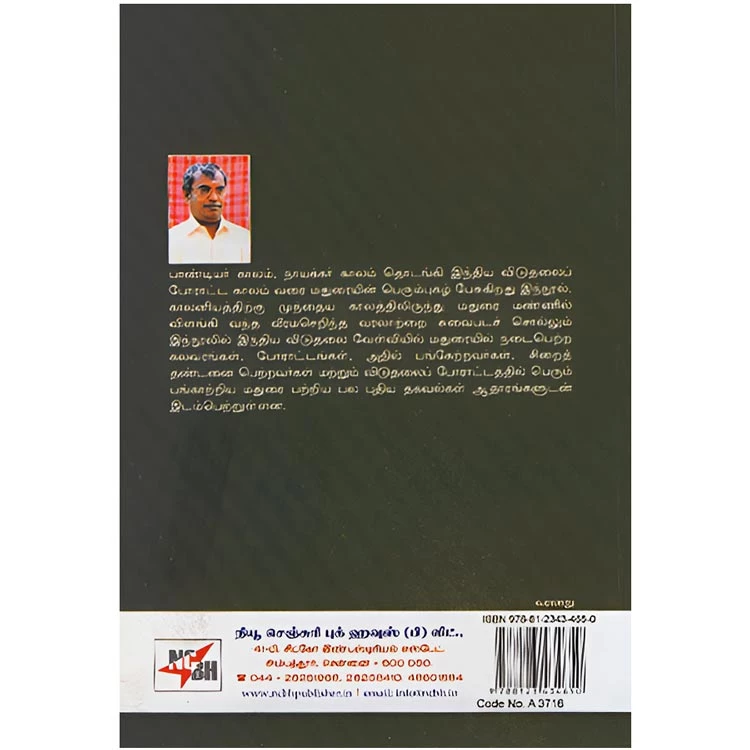 Details : ISBN : 9788123434650 Author : Pandurangan.N Weight : 100.00 gm Binding : Paper Back Language : Tamil Publishing Year : Code no : A3716 விடுதலை வேள்வியில் மதுரை : பாண்டியர் காலம், நாயக்கர் காலம் தொடங்கி இந்திய விடுதலைப் போராட்ட காலம் வரை மதுரையின் பெரும்புகழ் பேசுகிறது இந்நூல். காலனியத்திற்கு முந்தைய காலத்திலிருந்து மதுரை மண்ணில் விளங்கி வந்த வீரம்செறிந்த வரலாற்றை சுவைபடச் சொல்லும் இந்நூலில் இந்திய விடுதலை வேள்வியில் மதுரையில் நடைபெற்ற கலவரங்கள், போராட்டங்கள், அதில் பங்கேற்றவர்கள், சிறைத் தண்டனை பெற்றவர்கள் மற்றும் விடுதலைப் போராட்டத்தில் பெரும் பங்காற்றிய மதுரை பற்றிய பல புதிய தகவல்கள் ஆதாரங்களுடன் இடம்பெற்றுள்ளன. |