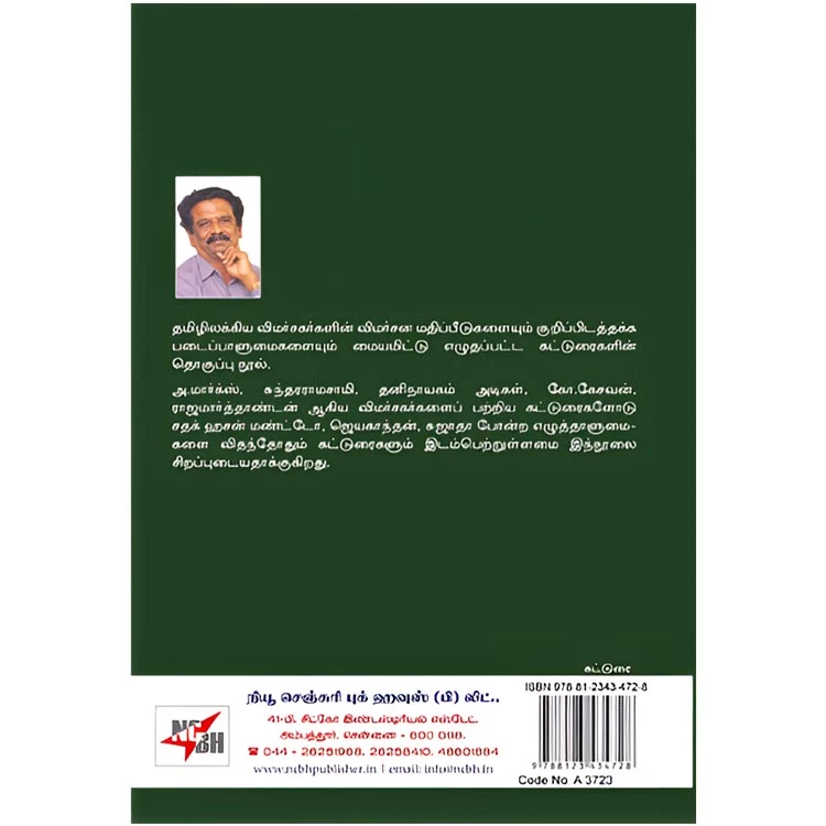 Details : Category : Essay ISBN : 9788123434728 Author : N. Murugesapandian Weight : 100.00 gm Binding : Paper Back Language : Tamil Publishing Year : 2017 Pages : 105 Code no : A3723 விமர்சகர்கள் படைப்பாளர்கள் : தமிழிலக்கிய விமர்சகர்களின் விமர்சன மதிப்பீடுகளையும் குறிப்பிடத்தக்க படைப்பாளுமைகளையும் மையமிட்டு எழுதப்பட்ட கட்டுரைகளின் தொகுப்பு நூல், அ.மார்க்ஸ், சுந்தரராமசாமி, தனிநாயகம் அடிகள், கோ.கேசவன், ராஜமார்த்தாண்டன் ஆகிய விமர்சகர்களைப் பற்றிய கட்டுரைகளோடு சதக் ஹசன் மண்ட்டோ, ஜெயகாந்தன், சுஜாதா போன்ற எழுத்தாளுமை- களை விதந்தோதும் கட்டுரைகளும் இடம்பெற்றுள்ளமை இந்நூலை சிறப்புடையதாக்குகிறது. |