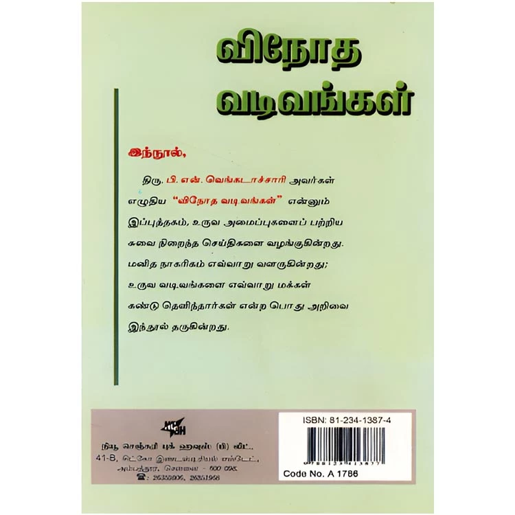 Details : ISBN : 8123413874 Author : P.N. Venkatachari Weight : 100.00 gm Binding : Paper Back Language : Tamil Publishing Year : 2008 Pages : 36 Code no : A1786 விநோத வடிவங்கள் : திரு. பி. என். வெங்கடாச்சாரி அவர்கள் எழுதிய “விநோத வடிவங்கள்” என்னும் இப்புத்தகம், உருவ அமைப்புகளைப் பற்றிய சுவை நிறைந்த செய்திகளை வழங்குகின்றது. மனித நாகரிகம் எவ்வாறு வளருகின்றது; உருவ வடிவங்களை எவ்வாறு மக்கள் கண்டு தெளிந்தார்கள் என்ற பொது அறிவை இந்நூல் தருகின்றது. |