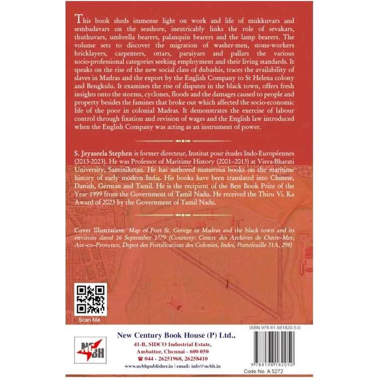 Details : Edition : 1 ISBN : 9788198182050 Category : History Author : S. Jeyaseela Stephen Weight : 150.00gm Binding : Paper Back Language : Tamil Publishing Year : 2024 Pages : 136 Code no : A5272 WORK AND LIFE OF THE PEOPLE IN THE BLACK TOWN AND IN THE SUBURBS OF COLONIAL MADRAS, 1641-1880 : This book sheds immense light on work and life of mukkuvars and sembadavars on the seashore, inextricably links the role of sevakars, thuthuvars, umbrella bearers, palanquin bearers and the lamp bearers. The volume sets to discover the migration of washer-men, stone-workers bricklayers, carpenters, ottars, paraiyars and pallars the the various socio-professional categories seeking employment and their living standards. It speaks on the rise of the new social class of dubashis, traces the availability of slaves in Madras and the export by the English Company to St Helena colony and Bengkulu. It examines the rise of disputes in the black town, offers fresh insights onto the storms, cyclones, floods and the damages caused to people and property besides the famines that broke out which affected the socio-economic life of the poor in colonial Madras. It demonstrates the exercise of labour control through fixation and revision of wages and the English law introduced when the English Company was acting as an instrument of power.