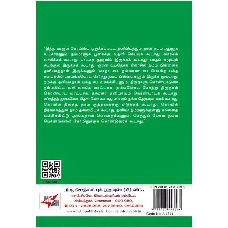 Details : ISBN : 9788123443584 Author : Marku Weight : 100.00 gm Binding : Paper Back Language : Tamil Publishing Year : 2022 Code no : A4711 யாத்திரை : “இந்த ஊருல கோயில்ல ஒதுக்கப்பட்ட தனியிடத்துல தான் நம்ம ஆளுக உட்காரனும். நம்மாளுக பூசைக்கு உதவி செய்யக் கூடாது. வாசகம் வாசிக்கக் கூடாது. பாடகர் குழுவில் இருக்கக் கூடாது. பாதம் கழுவும், சடங்குல இருக்கக் கூடாது, ஞான உபதேசக் கிளாசில் நம்ம பிள்ளைக் தனியாத்தான் இருக்கணும். மாதா சப, நன்மரண சப போன்ற பக்த சபைகள்ள அவுங்களோட சேர்ந்து நம்ம பிள்ளைகளும் இருக்க முடியாது நமக்கு தனியாதான் பக்த சப வச்சுக்கிடணும். திருநாளு கொண்டாடுனா நம்ம கிட்ட வரி வாங்க மாட்டாக. நம்மளோட சேர்ந்து திருநாள், கொண்டாட மாட்டாக, நாமளா தனியாவும் கொண்டாடக் கூடாது. சப்ரத்தத் தூக்கவோ, தொடவோ கூடாது. சப்பரம் நம்ம தெருவுல வரக் கூடாது, கோயில் நிலத்த நாம குத்தகைக்கு எடுக்கக் கூடாது. கோயில் நிர்வாகத்துல நாம தலையிடக் கூடாது. தனியா நம்மளுக்குன்னு கல்லறை வச்சிக்கிட்டு அங்கதான் பொதைக்கனும். செத்துப் போன நம்ம பொணங்களை கோயிலுக்குக் கொண்டுவரக் கூடாது.” |